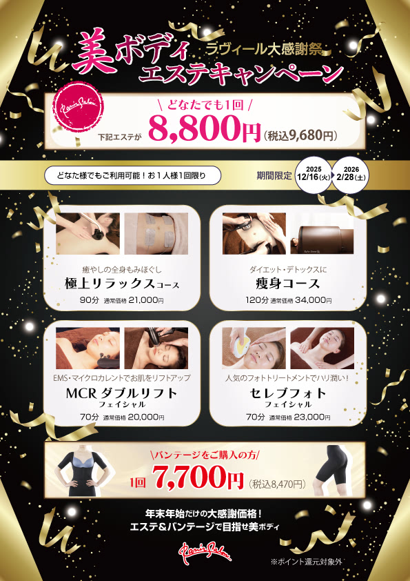 痩せたい!美しくなりたい!健康で楽しい生活を送りたい!欲張りな女性のニーズにしっかりより添い。お得なサービスで、エステは特別ではなく日常の一部にしていただけるサービスをご提案。